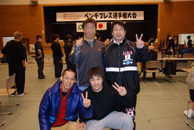 我慢していた缶コーヒーを解禁 蓋を開けて床に置いていたところ 「会場内での飲食は禁止」のアナウンス 体育館を出ようとしたところ 隣の方から「コーヒーこぼれてますよ」と 優しく肩を叩かれた う~~む嫌な予感 ありったけのテッシュを使って拭き取り 一階ロビーへ 朝とても早く起きてもらっているので頑張らねば! と闘志がガンガンわいてくる 巨人の星のオープニングのように 愛情のたっぷりこもったオニギリを 青空にかざしている図 ご飯 のり 具すべてが美味しい チーム北海道のhさんといっしょにご飯を食べた お腹も満たされ、体育館に戻るとパワーボム大将の姿が! http://www.geocities.jp/powerbombgym/ 一年ぶりの再会を喜び固い握手 太陽のような笑顔は昨年同様だ 強敵(とも)=ライバルとして お互いのベストを尽くすことを約束した 来年、私はMⅡになってしまうが 生涯の強敵(とも)にさせてもらい 切磋琢磨して、より「最強」を目指そう これまたジャニーズ系イケメンに声をかけられた それは、なんとケンタロウさんだった http://ameblo.jp/tatekenta/ かわいいお子さんと美人の奥様も応援に来ている う~~ん いいなぁ~ (将来、イケメンベンチプレス王になるお父さんを しっかり目に焼き付けておくんだよ^^) 写真は・・・ のちのジャニーズ系ベンチプレス王、イケメンベンチプレス王である ふたりが中年ベンチプレス王になるころ 私は老人ベンチプレス王になる! それまで長生きしよう~っと http://z350.blog83.fc2.com/ 秘密兵器の携帯電話を使うと目の前に^^ 一年ぶりの再会、近況を語り合う う~~ん元気そう しかぁ~~しぃ な、な、なんと左の薬指が骨折したまま曲がってるぅ~@@; なんたる闘魂 さすが標準記録を突破する人はすごい この指でグレシー柔術もやり、ベンチもやるとは超人である 写真は左上がBLACKPEARL4さん、左下がパワーボムジム長尾さん 右上が私、右下がモーガンさん 北海道からはhさん、yさん、nさん、Oさん、私の5人出場している そこで、若手と作戦会議をした Oさんは重量級なので軽量級のhさんがセコンドに付くこととし その間は順番に補ってセコンドとアップの補助をすることにした 決戦準備は整った あとは仮面ライダー海斗さんを探すのみ さてさて、はたして海斗さんと巡り会うことが出来るのか う~~んと悩んでいるうちにアップの時間が来た つづく PR この記事にコメントする